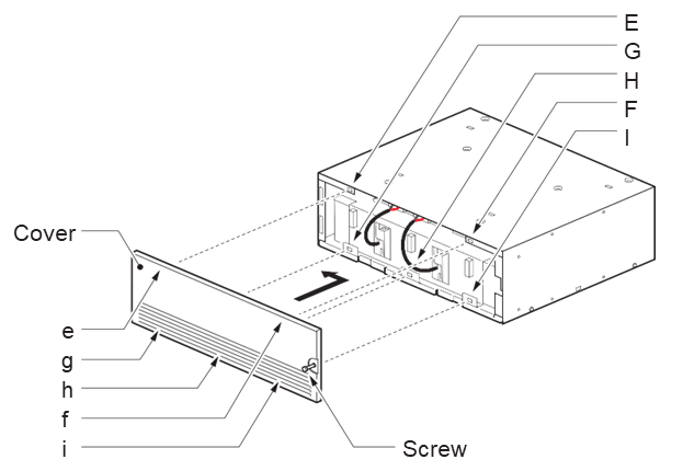 Вставьте выступы (от e до i) на крышке в отверстия (от E до I) на CHSG LARGE BATT BOX. Сдвиньте крышку влево до посадки.