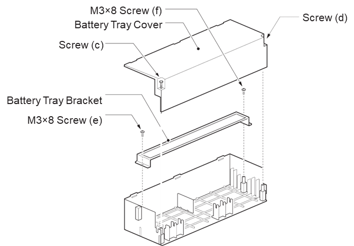Ослабьте два винта (c и d) и снимите крышку батарейного отсека. Отвинтите два винта M3 × 8 (e и f) от кронштейна поддона аккумулятора и снимите кронштейн.