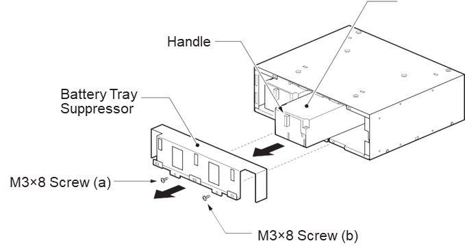 Снимите два винта (a и b) с передней части ограничителя поддона аккумулятора.