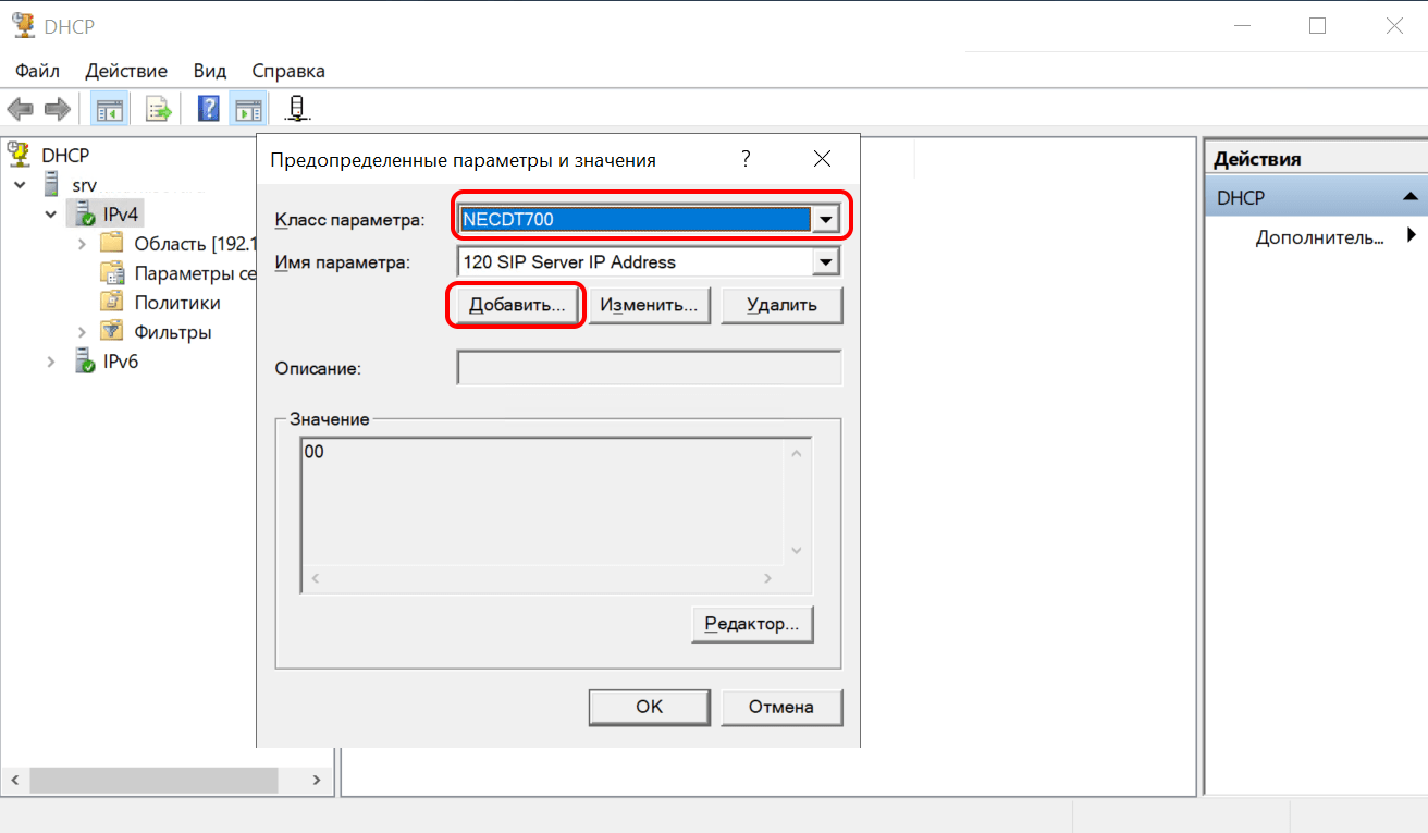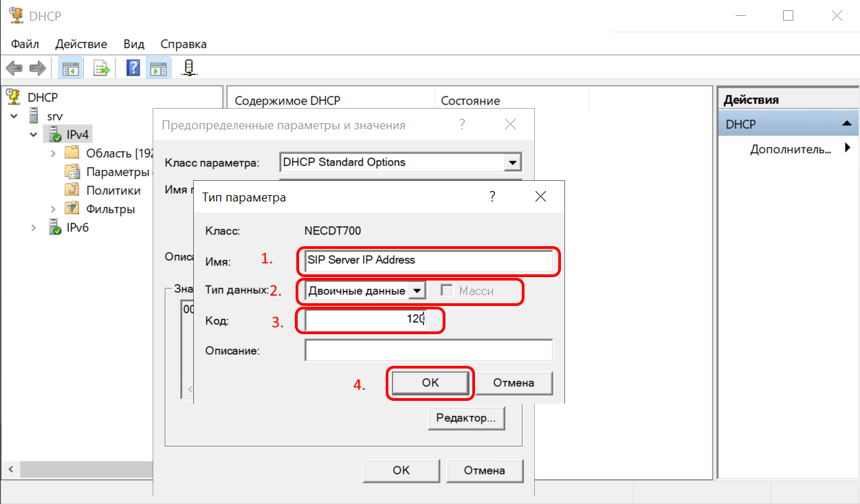 - Создание предопределенного параметра 120 SIP Server IP Address.