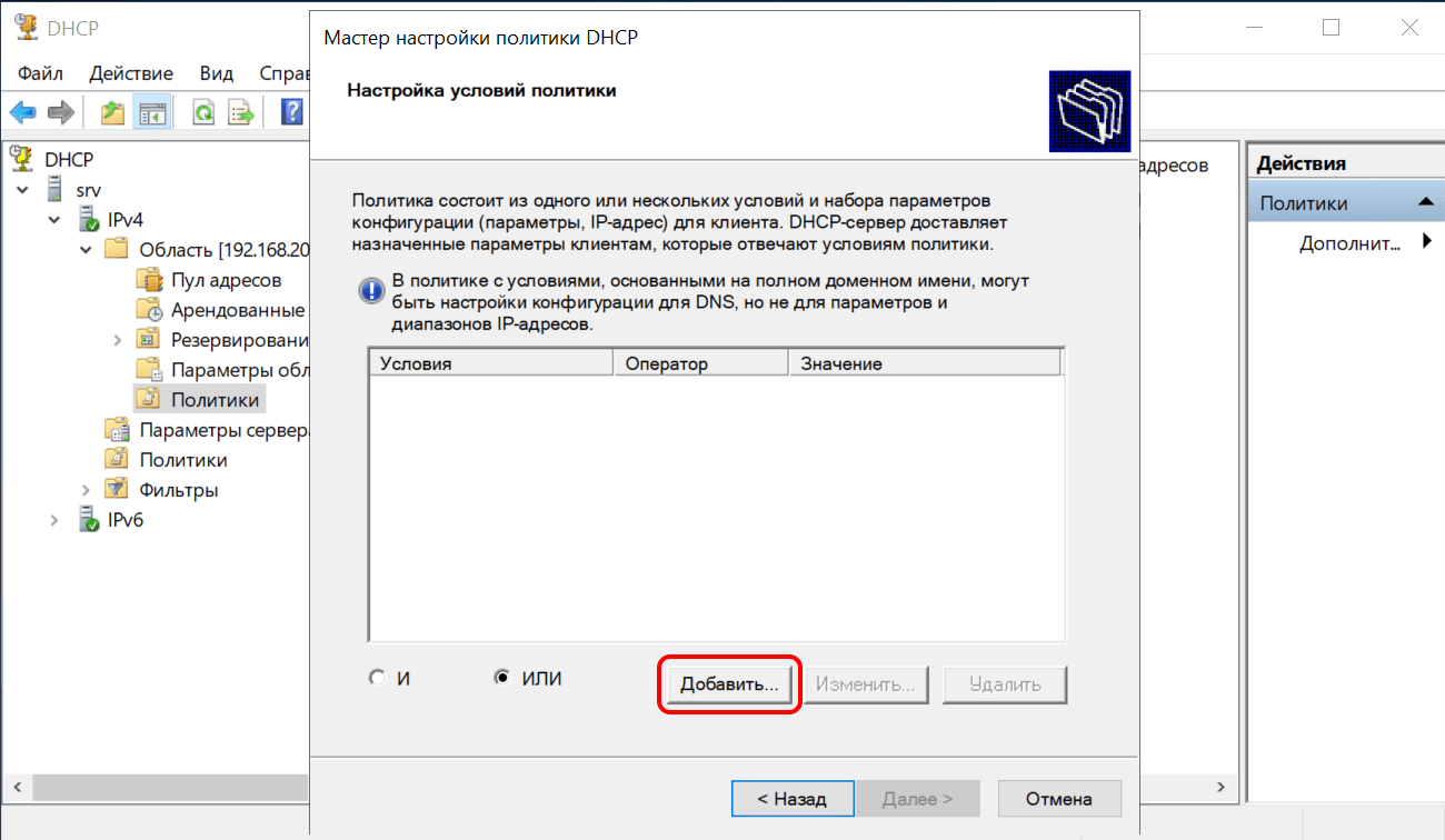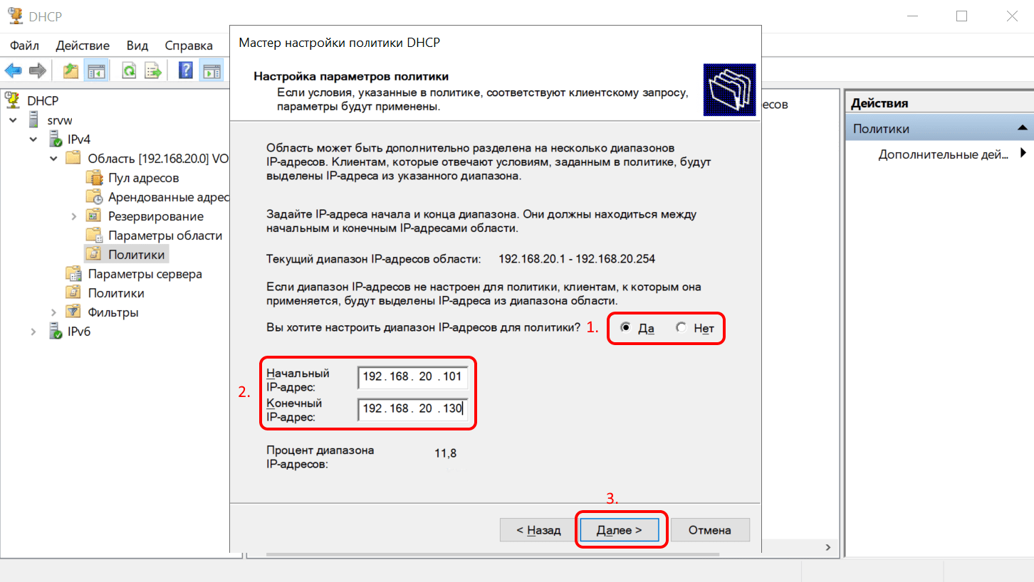 - Укажите диапазон адресов в пределах которого будет применяться создаваемая политика.