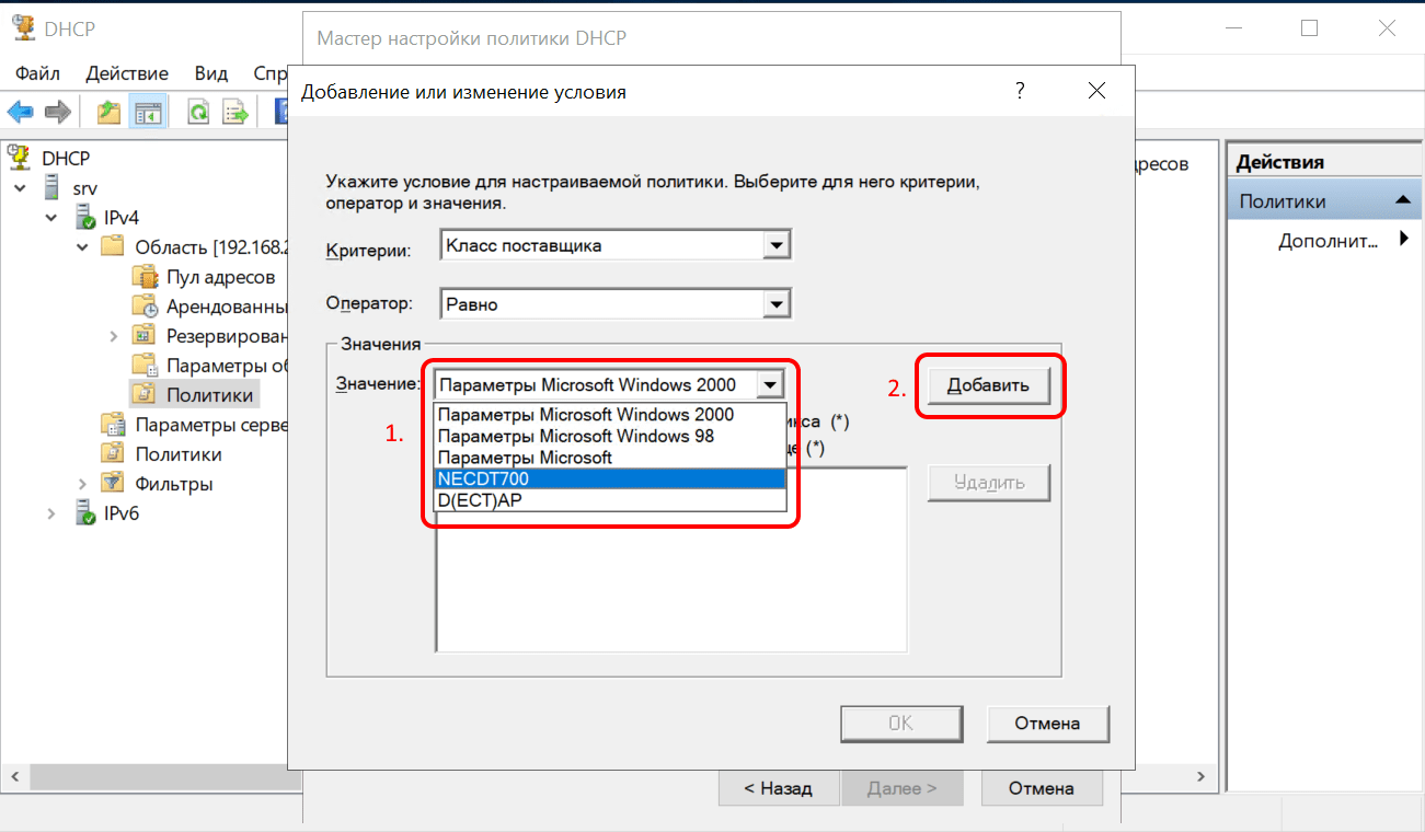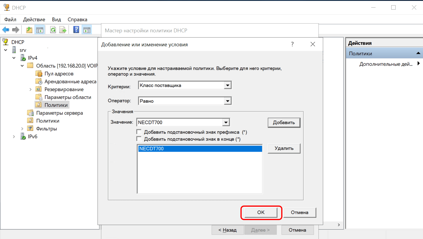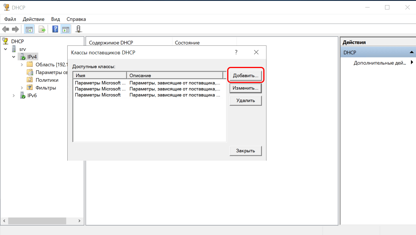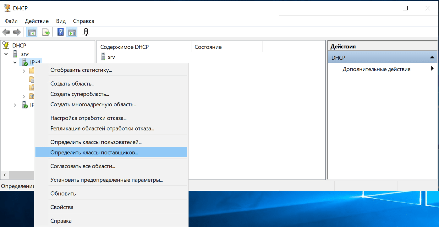 - Откройте консоль DHCP сервера, щелкните правой кнопкой мыши IPv4 и выберите Определить классы поставщиков.