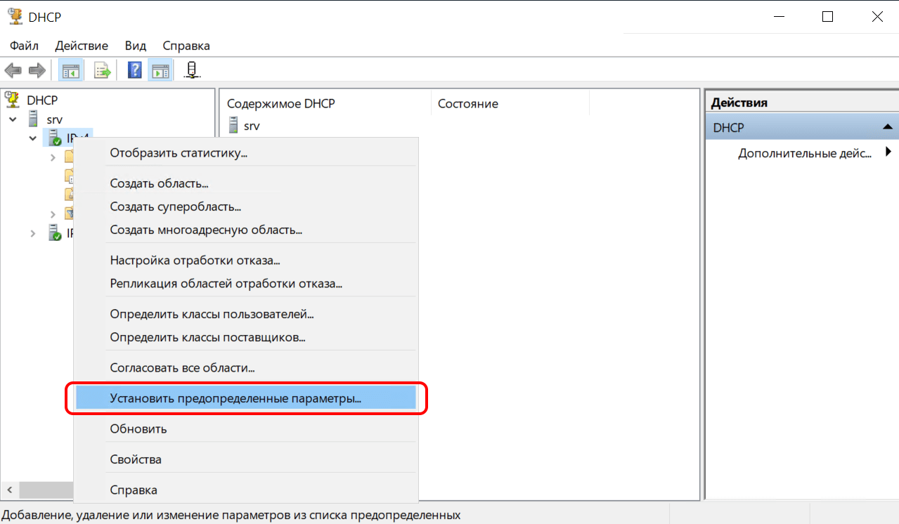 - Откройте консоль DHCP сервера, щелкните правой кнопкой мыши IPv4 и выберите Установить предопределенные параметры.